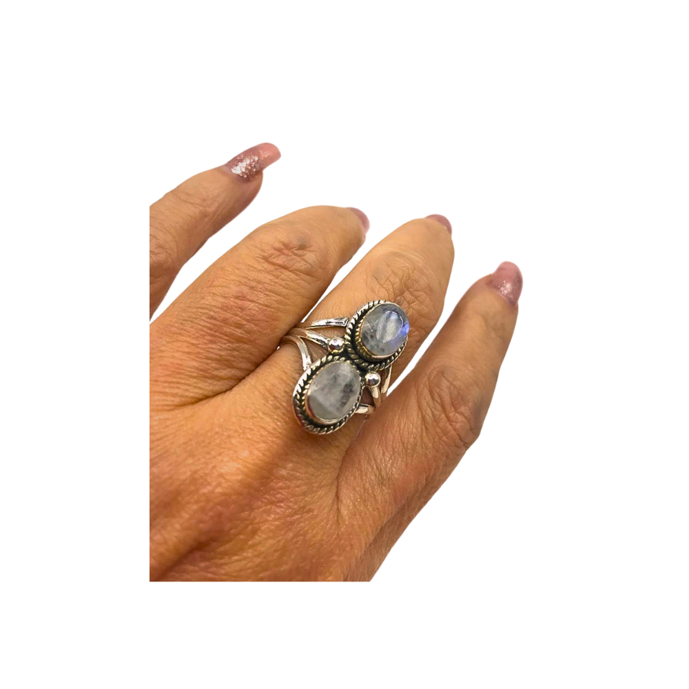 Anel Indiano em prata 925, com aro triplo de tamanho 19. Com duas pedras da lua, conhecidas por seu brilho suave e efeitos ópticos únicos, adicionam um toque místico ao design. Os adornos ao redor das pedras contem um trabalho detalhado com motivos tradicionais e padrões intricados tipico da cultura indiana.