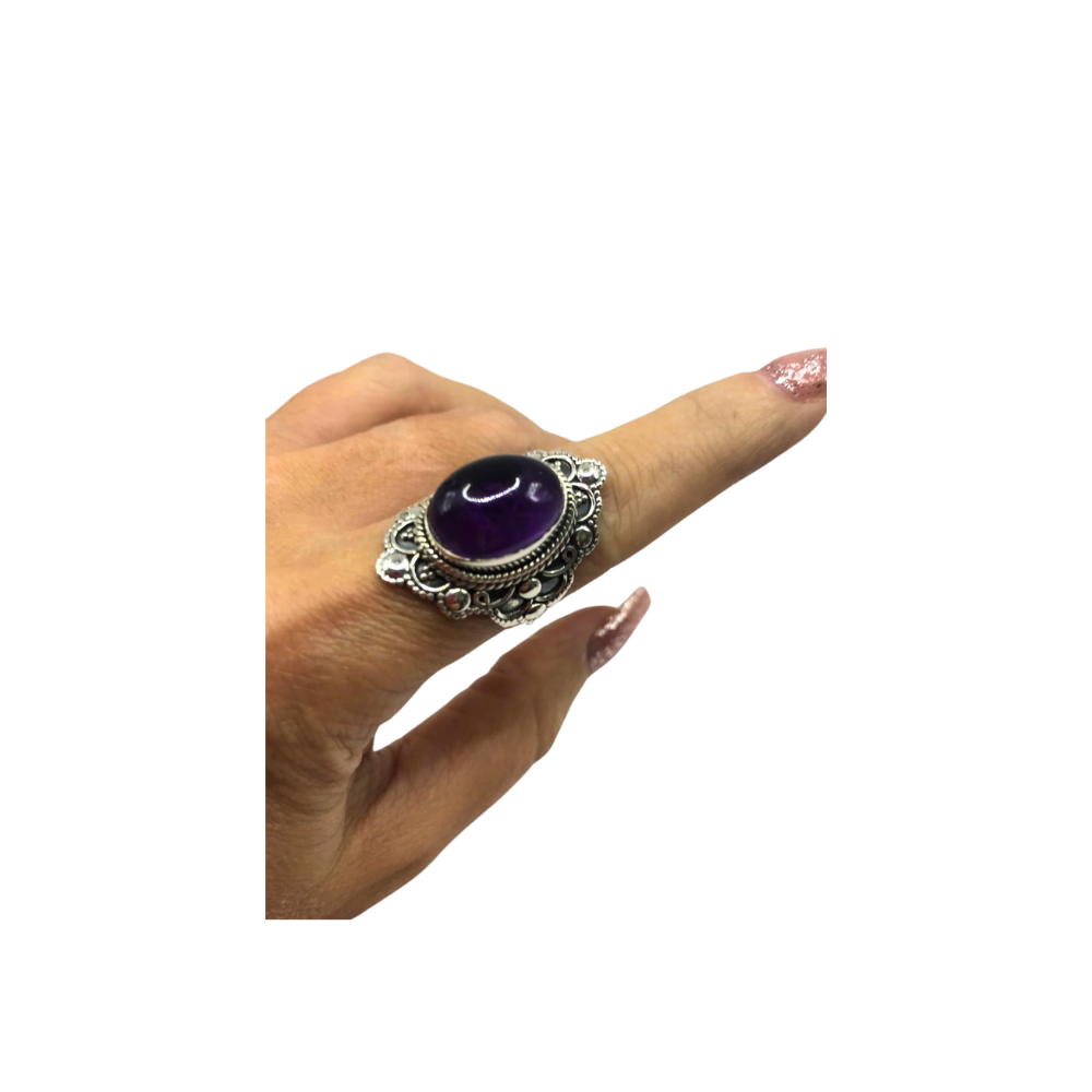 Anel em prata 925, importado da Índia, com uma deslumbrante ametista oval no aro 19. Rico em adornos ao redor da pedra, este anel combina elegância e um toque exótico, perfeito para quem aprecia detalhes sofisticados.