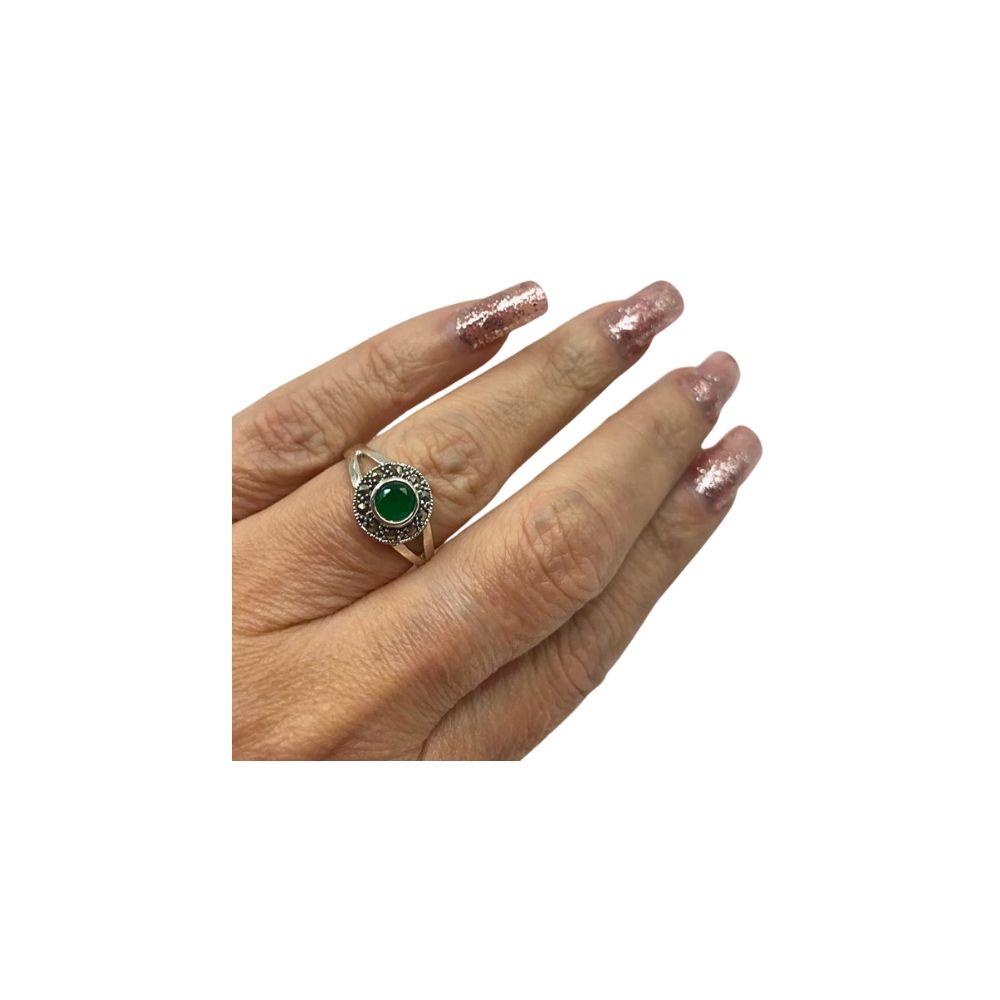 Para complementar a beleza da esmeralda, o anel é adornado com marcassitas, pequenas pedras que acrescentam um toque vintage e de brilho sutil à joia. As marcassitas, combinadas com a prata 925, criam um contraste encantador, realçando ainda mais a esmeralda. Aro tamanho 19.