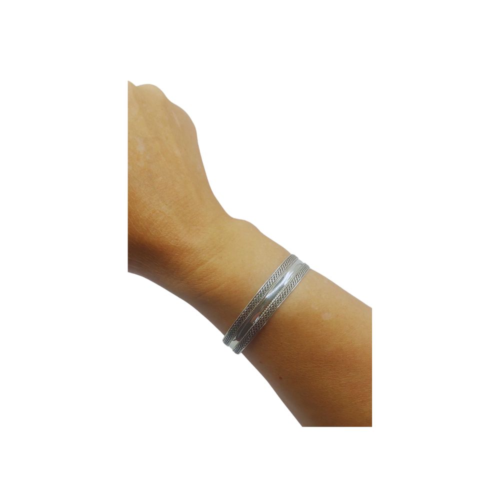O bracelete de prata 925 importado de Bali, com um peso de 12gr, possui um acabamento luxuoso que destaca sua qualidade e sofisticação. A parte central do bracelete é lisa, proporcionando uma superfície polida e elegante. As bordas são decoradas com ornamentos gravados na prata, que adicionam um toque detalhado e artístico à peça. A combinação do acabamento polido com os ornamentos gravados faz desta joia uma escolha refinada e marcante.