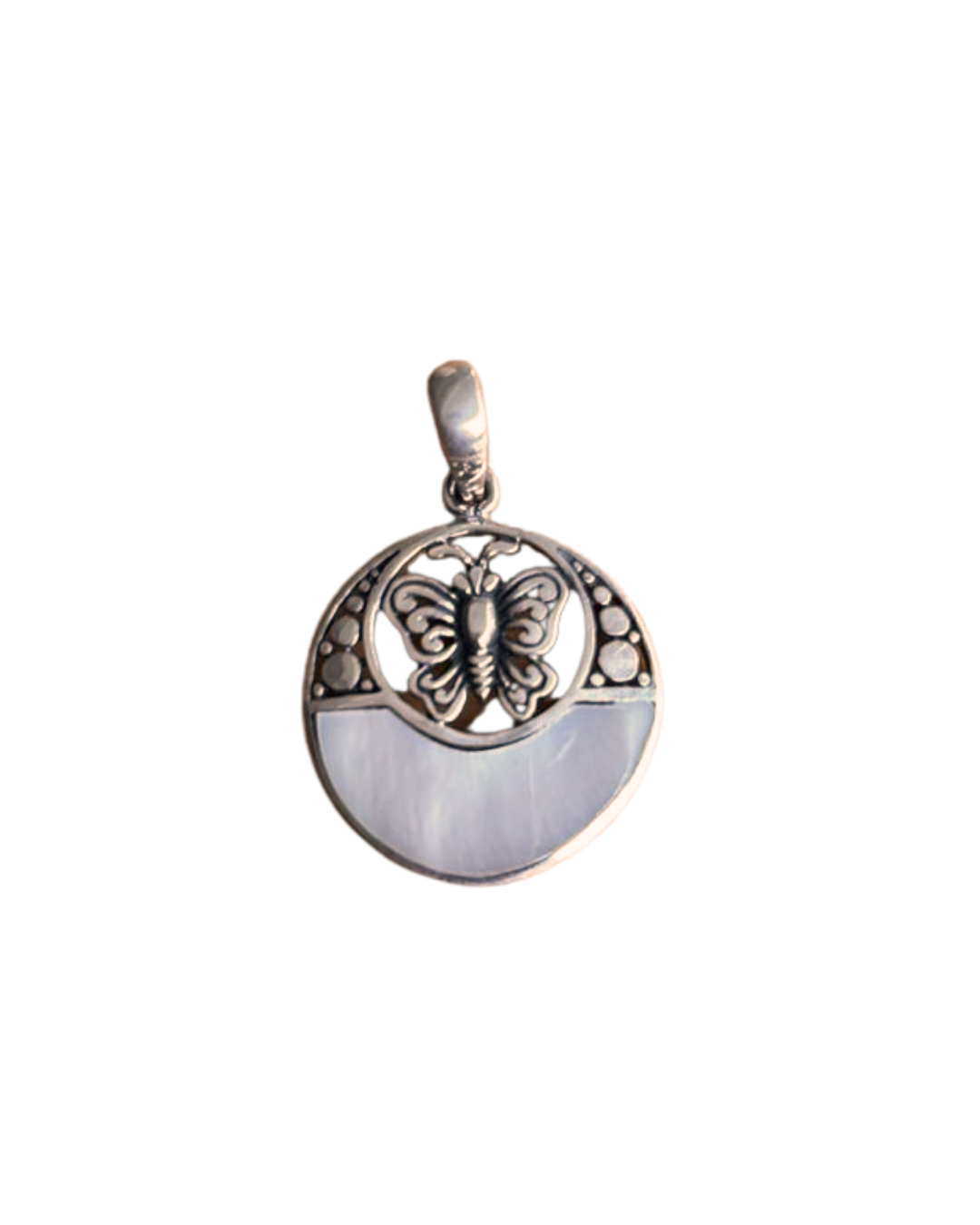Pingente de madrepérola com uma borboleta de prata 925 é uma joia delicada e feminina, que une o brilho suave e perolado da madrepérola com o acabamento refinado da prata de lei (925). A borboleta simboliza transformação, leveza e renovação.